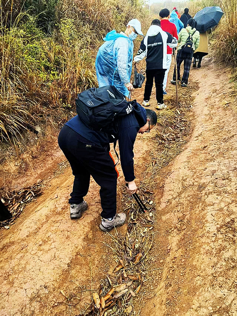 老牛坡现在主打的是越野车、摩托车线路,也就导致了整个线路肯定是土路,刚好一辆车的宽度,两边被轮胎压出了深深的凹坑,遇到下雨天,整个泥泞得不成样子,所有的人鞋子、裤子都不可避免的遭殃。大约5公里的路程,没有人埋怨吐槽,反而是仙境中行走,春天里漫步的喜悦。因年龄、性别的差异,队伍有人快有人慢,拉得很长,前面的同学把垃圾都捡走了后面的出现“寻宝”的现象。